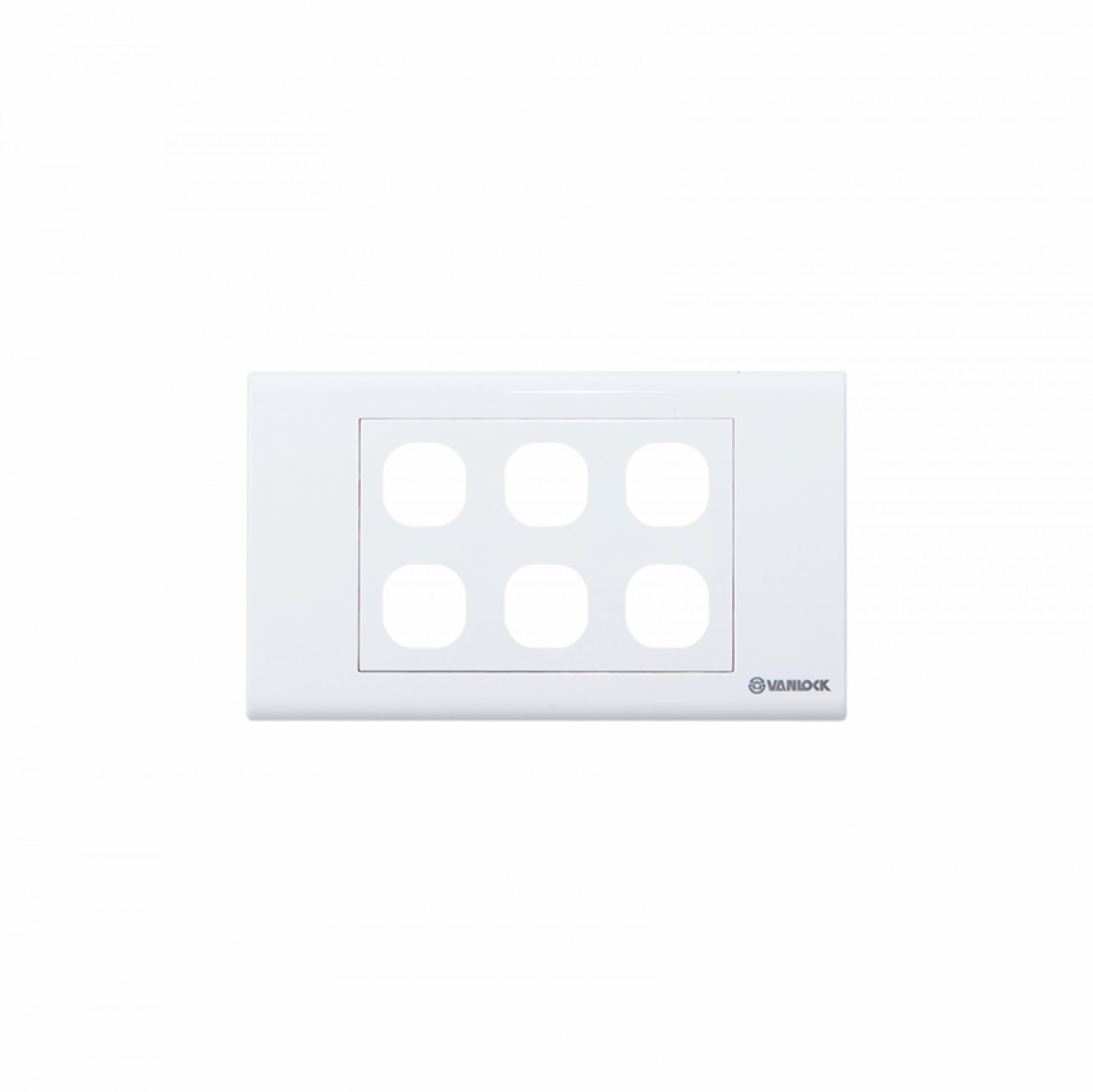 Mặt 6 lỗ- Sino Vanlock – S186/X cho 6 hạt công tắc đơn được làm bằng nhựa Polycarbonate cao cấp, loại nhỏ thiết kế đơn giản, phẳng, vuông vắn, màu trắng theo tiêu chuẩn châu Âu, khả năng chịu lữa, chống cháy, chống va đập