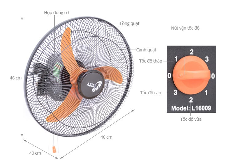 - Quạt Treo Tường Bán Công Nghiệp Asia có kiểu dáng sang trọng, màu sắc trang nhã, thiết kế treo tường tiết kiệm diện tích.